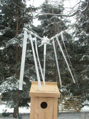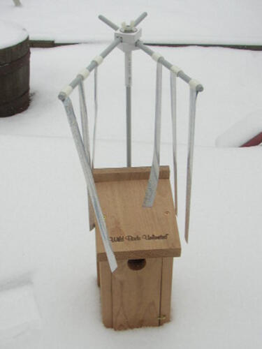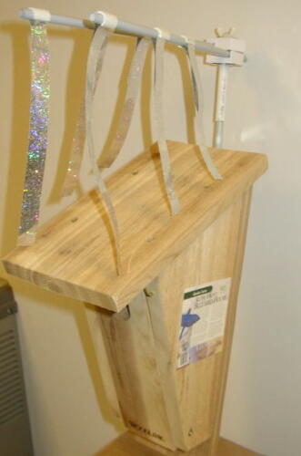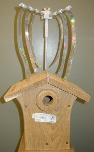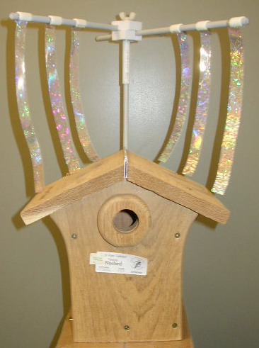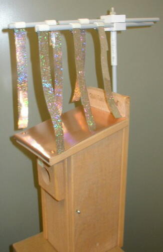 “A sparrow spooker is a device that has proven to be an extremely effective house sparrow deterrent when attached to a Bluebird nestbox after egg-laying has commenced. It is impossible for a Bluebirder to watch a nestbox 24 hours a day, but a sparrow spooker is on duty full-time, from first egg-laying to fledging day. Bluebirders have recognized the life-saving value of sparrow spookers, and some have been constructing makeshift Spookers for the past 22 years. Many variations on the original design have been tried, but the basic premise is always the same – shiny, fluttering streamers suspended above the nestbox discourage House Sparrows from entering the box, but when installed after the Bluebirds are committed to a nesting site (once the first egg is laid) they don’t deter Bluebirds at all.”