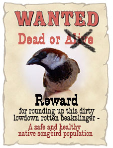 Why trap sparrows? The English House sparrow is a non-native, invasive species imported from England in the mid 1800s. As invasive species, the English House Sparrow, as well as the European Starling and Pigeon are NOT protected by the laws that protect our native birds. Disposition of the House Sparrow and the Starling is not only legal, but in many cases encouraged.